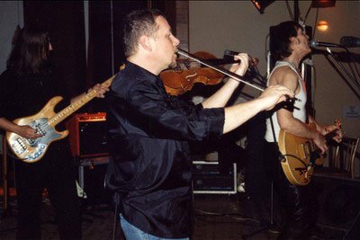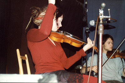 těleso Pod černý vrch. Jejich troje housle,viola plus baskytara a bubny