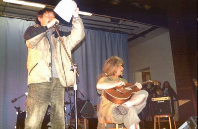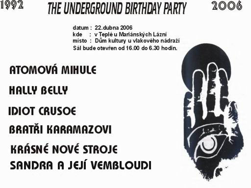 THE FRIEND´S BIRTHDAY PARTY Datum:22.dubna 2006 Dům kultury v Teplé u M.Lázní Od 16.00 hod. do 6.00 hod. Tato každoroční undergroundová narozeninová oslava proběhla už po čtrnácté 22. 4. 2006 v Kulturním domě Teplá u Mariánských Lázní. Na pódiu se objevilo množství výjimečných hudebních těles známých z nekomerční scény. Úvodem nám zarecitoval svou temnou poezii výtvarník a básník Jiří Svině Fiala za doprovodu Londýna a spol. pod názvem Hipres 10. Jako druhá parta nastupuje žďárská Atomová mihule. Mezitím dorazil Svědek a jeho soubor Hally Belly, ovšem bez kytaristy, který se někde zapomněl, a přitom už měli pomalu začít hrát… Naštěstí se právě objevila undergroundová kapela z Brna, která si říká Idiot Crusoe. Polkli nějaké to pivečko a skočili na pódium. Během jejich vystoupení se našel kytarista z Hally Belly a už to všechno na sebe navazovalo a šlapalo, jak má. Po Hally Belly nastoupili českokrumlovští Bratři Karamazovi, kteří den před tím hráli na podobné akci v Brně u Jaroslava Erica Friče. A za pódiem je už připraven soubor Krásné nové stroje z Kutné Hory. Předposlední soubor Sandra a její vembloudi přijel z Mostu. Jejich zajímavá image a trochu ostřejší muzika nad ránem probrala unavené spáče…A na úplný závěr zazněly indiánské rytmy, postupně se k Indiánovi připojil bubeník z Bratrů Karamazových a další nadšenci hrající na bonga.Velký dík patří zvukařům, všem kapelám, pořadatelům, kteří z části tenhle „narozeninový koncert“ sponzorují, a vůbec všem, kteří se nějak podíleli na uskutečnění této akce. Oni už budou vědět.. Takže zase za rok! FOTOGRAFIEFOTOGRAFIE 2